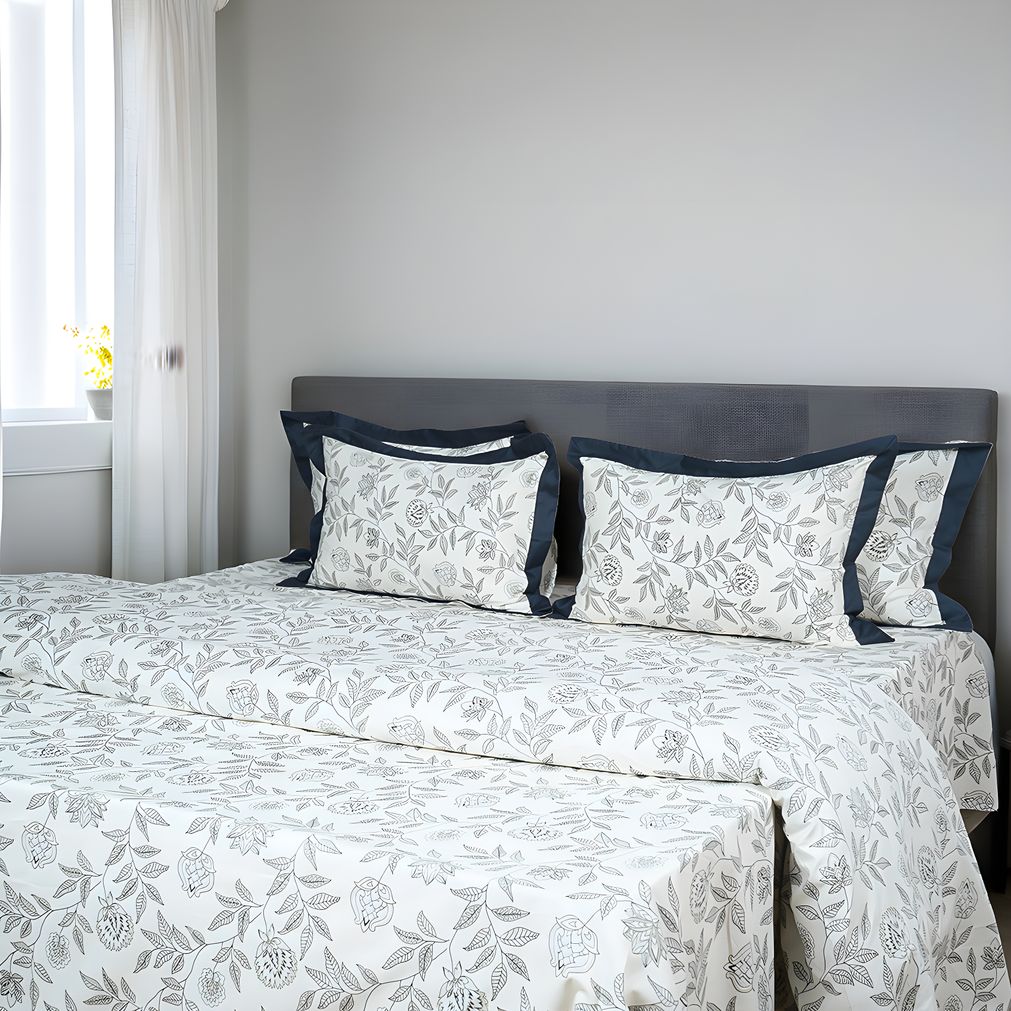 Crisp, modern, and effortlessly calming—the Zeno bedsheet features a minimalist botanical print with a deep navy border, adding a clean and balanced touch to your bedroom. Perfect for contemporary spaces, it creates a tranquil vibe without compromising on style.