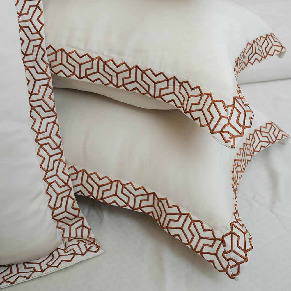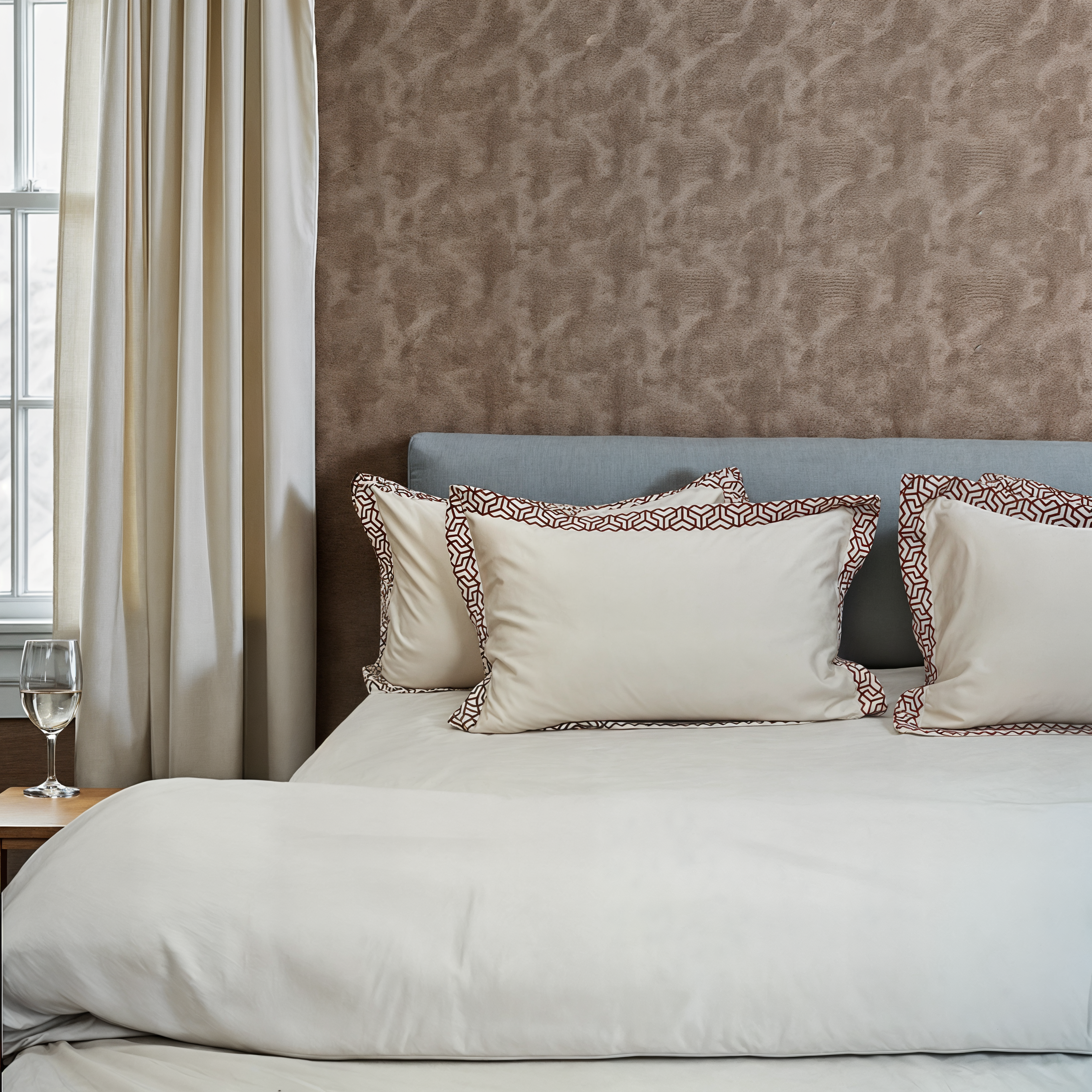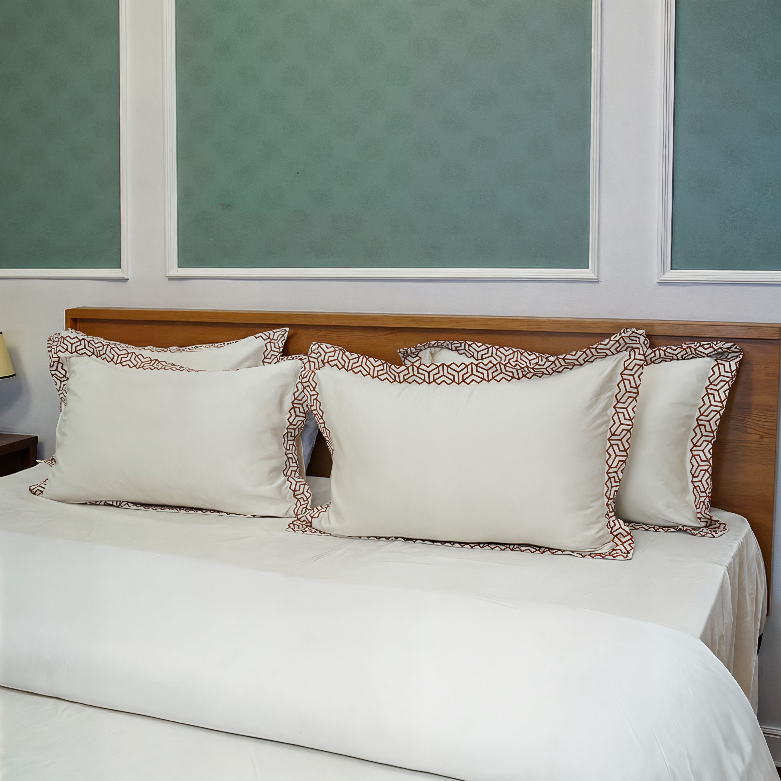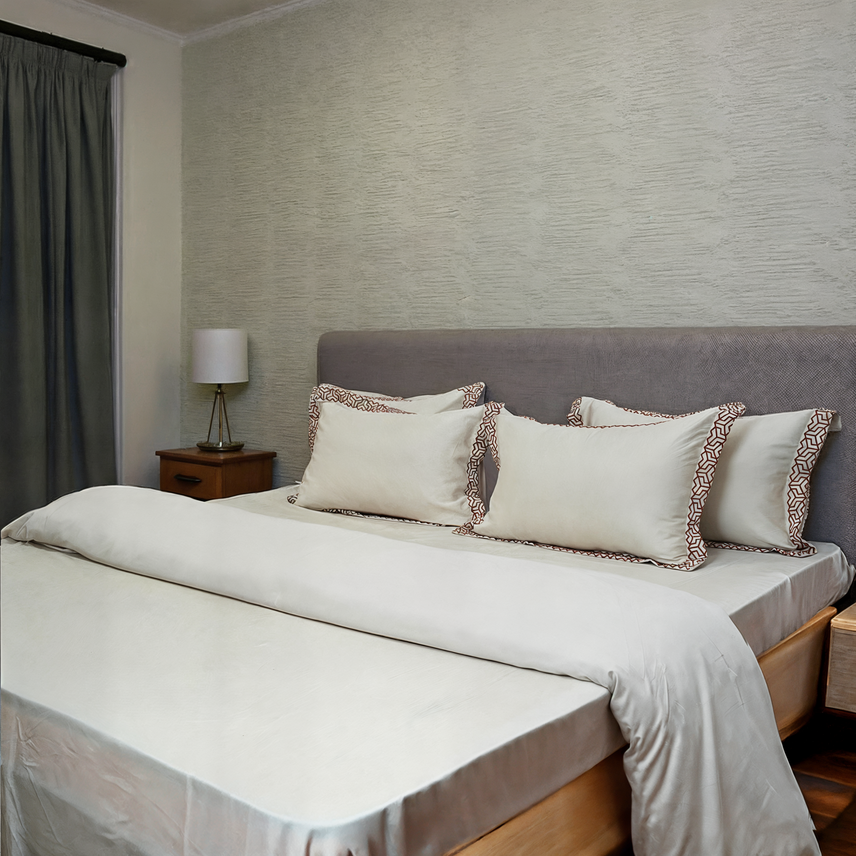 Sleek, serene, and sophisticated—the White Skin bedding set blends timeless elegance with a bold modern twist. Featuring crisp ivory fabric accented by a rich geometric border, it elevates your room with subtle luxury.